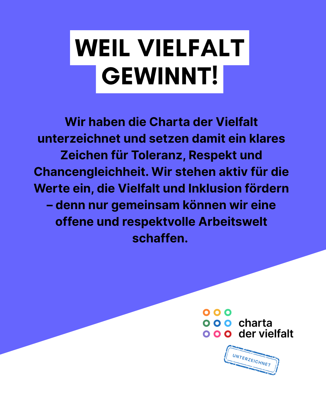 Wir haben am 3. November 2025 die Charta der Vielfalt Charta der Vielfalt unterzeichnet und bekennen uns zu Diversity als Erfolgsfaktor